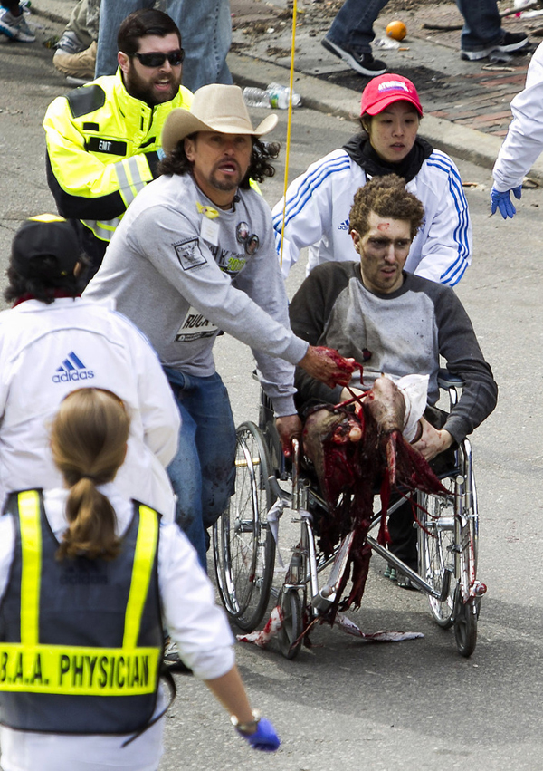 These false flag operations are full of obvious holes to anyone who takes the time to have a closer look at them. Here’s a photo from the Boston Marathon “bombings”, for example. This man who was supposed to have had his legs blown off in the marathon is a well known “crisis actor”. See more about him  here and here